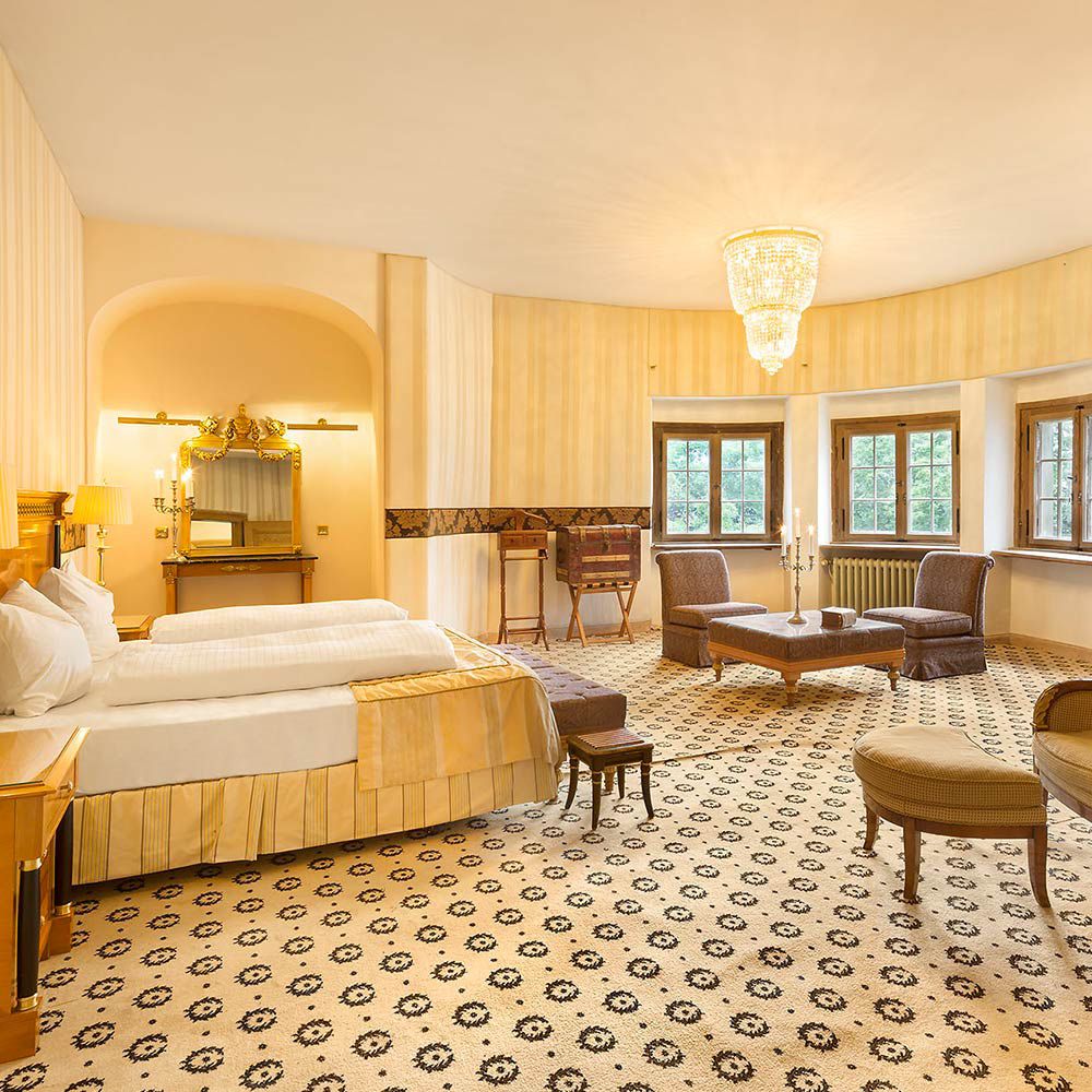Übernachtet in luxuriösen Zimmern mit echten Betten vom Ritz-Carlton Hotel — keine Zelte, sondern Komfort direkt im Schloss.